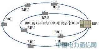 我们先看一下现有的基站传输组网情况。现有基站主要有一体化基站或分布式BBU+RRU两种。分布式基站是把传统基站的基带处理部分(BBU)和射频部分(RRU)分开的基站设备形态。BBU与RRU之间采用高速CPRI光接口,一般采用光纤直连的方式,如果采用远供方式,传输距离在200 m以内。室分基站存在多个RRU级联共享一个通用公共无线电接口(CPRI)的组网模式,目前典型级联配置多是2~3级RRU级联实现频点覆盖;虽然设备可以支持6级级联,但由于可靠性、可维护性等限制因素,基本无应用。