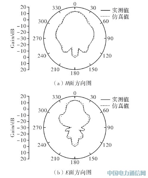 天线中心频率为1 600 MHz,图4是f=1 600 MHz天线的辐射方向图,图中实线代表实测值,虚线代表仿真值。可以清楚地看到,实测方向图与仿真方向图吻合良好,且方向图对称性较好。天线3 dB波瓣宽度为35°,通过微波暗室实测,天线最大增益可达13.3 dBi.为体现增益的提升,给出了f=1 600 MHz未加反射器时的天线方向图仿真值,如图5所示,图中实线代表H面方向图,虚线代表E面方向图。从仿真值可以看出,天线在为未加反射器时的增益为10.6 dBi,充分说明加反射器后,天线增益得到了显著提升。