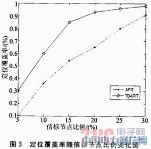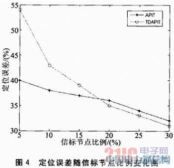 定位误差随信标节点比例变化图如图4所示。该仿真结果说明,在网络部署一定时,当两种算法的定位误差达到35%左右时,两者的定位精度很难再得到明显改善。在信标节点比例为5%左右时,TDAPIT的定位误差明显大于APIT的定位误差,这是因为在网络的初始阶段,APIT可定位的节点数目较少,而TDAPIT能够定位的节点相对较多,而且TDAPIT定位时,利用了本身定位就有误差的已知节点,使得定位出的节点的误差得到累加,明显加大了定位误差。当信标节点比例在20%左右时,两种算法的定位误差变化不明显,此时增加信标节点比例时,TDAP IT略显优秀,但定位误差仍然在30%以上,由此可见这种非基于测距的定位方法虽然成本较低、实现简单,但是定位误差比较大,而且当信标节点比例达到30%时,定位误差仍然在30%以上,此时即使增加信标节点的比例也很难改变定位误差。