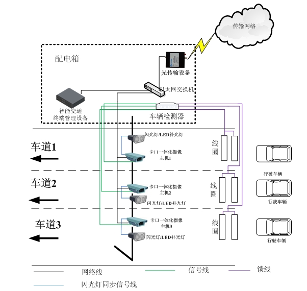 前端数据采集子系统对经过的所有车辆进行抓拍,获得车辆图像,并自动实时地识别车牌字符,记录下车辆经过的时间、地点、车牌号、行驶方向等数据,并全部汇入网络传输子系统,传输至中心管理平台。该部分系统由200万高清摄像机、LED灯/闪光灯、线圈、车辆检测器、SD存储卡/终端管理设备、以太网交换机、光传输设备等组成。