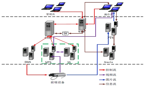 中心管理平台组成如(图4)所示,模块组成包括:1、业务管理服务器(CMS);2、流媒体转发服务器(MTS);3、流媒体集中存储服务器(SS);4、设备管理服务器(DMS);数据库服务器;5、图片服务器(PTS);6、Web服务器。根据实际的情况,部分服务模块可以安装在通一台服务器中。