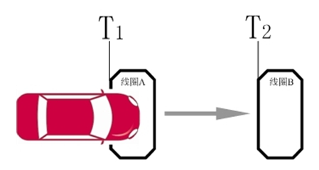 为在高清智能卡口管理系统中,在每条需要监测的车道上沿行车方向埋设两个线圈,线圈之间的间距是固定的,对于经过的车辆,可以取得四个时刻,分别是车辆进入两个线圈和离开两个线圈的时刻。计算车辆通过两线圈所需的时间,配合两线圈的间距,即可求得平均车速,如图所示。