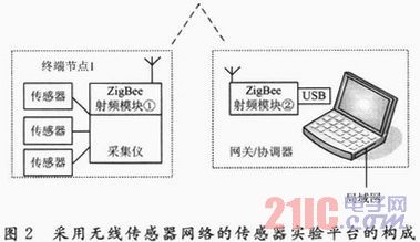采用ZigBee无线网络的传感器实验平台,各种类型的传感器仍通过原有方式接入采集仪,各工位的采集仪作为ZigBee终端节点,而配置一台电脑作为协调器,构成星型网络拓扑结构的无线网络(如图2所示,图中只示意出一个工位的终端),并可通过该协调器接入局域网,这样所有实验工位的显示和处理终端则可在该局域网内访问所有的采集仪终端。