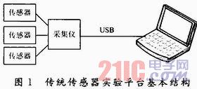 传统传感器实验平台通常由一套多种传感器、数据采集卡及上位机界面显示软件组成,结构如图1所示。其中,各种类型传感器的输出的电信号,经A/D转换后,由数据采集卡通过USB接口将其输入到上位机显示或处理。学生在做实验时,可根据需要调用不同的界面程序,显示或处理不同类型的传感器检测数据,或者直接用万用表或示波器观察传感器输出的电信号即可。其基本构成特点是系统组成结构层次清楚,但整套设备围绕实验工位布置,约束了实验空间仅局限于实验台附近,一些远距离测量和移动性要求高的测量场合难以得到满足。
