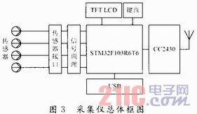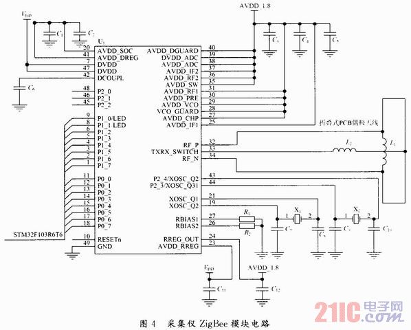 由之前的分析可知,改造的关键之处在于采集仪的设计,采集仪通过ZigBee射频模块①以终端节点的形式加入ZigBee无线网络。它采用ST公司基于Cortex-M3核的STM32F103R6T6处理器,可选择电池或墙上电源供电,可方便地进行移动式测量,如图3所示。该处理器本身具有:1个USB接口,2个12位的ADC,20 KBSRAM,128KB FLASH等,这已经可以满足本采集仪的所有技术需求。由于STM32F103R6T6内部自带多路A/D转换器,所以电路得到了极大简化。ZigBee RF无线芯片采用TI的CC2430,其内部具有一个8051单片机专门用于ZigBee协议栈处理,工作在2.4GHz频段,数据通信速率可达250Kh/s,可与STM32F103R6T6进行方便的接口配接,其电路如图4所示。