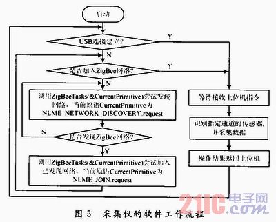 采集仪的软件设计中,无线部分采用TI公司免费提供的ZigBee协议栈。采集仪启动后,首先检测是否存在USB连接,如果存在则按USB通信链路进行工作;否则启用并配置为ZigBee终端节点。然后尝试发现网络,并向协调器发出建立ZigBee网络连接请求。