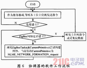 协调器仅需要在市场直接采购ZigBee USBDongle模块就可完成配置,其主要功能是管理整个ZigBee网络,当有节点加入或者退出网络时,更新相关的信息,并处理各种ZigBee功能,如创建或修改绑定表、为ZigBee节点分配群集(Cluster)ID等。其流程如图6所示。