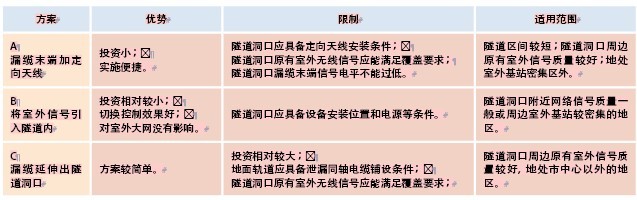 特点:该方案投资相对较大,并且由于泄漏同轴电缆铺设受地面轨道结构限制较大,在露天环境中泄漏同轴电缆所辐射的信号如控制不当,易对室外大网信号造成干扰。以上三个方案的优劣势以及适用范围如表1所示。