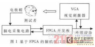 脑机接口系统是由人和机器构成的闭环系统[3]。除人本身外, 脑机接口系统包括:信号采集、信号处理、外部设备及控制部分。本文的方案采用FPGA取代计算机,作为脑机接口的控制和信息处理器。主要包括脑电采集电路、基于FPGA的VGA视觉刺激器和FPGA开发板三部分,如图1所示。