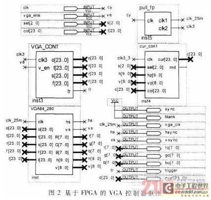 本文的方案是基于FPGA的VGA视觉刺激器,采用VGA显示器作为视觉刺激器,通过VHDL编程的方式产生图形刺激信号。FPGA是一种半定制电路,具有很强的在线修改能力,可以随时修改设计而不必改动硬件电路。因此,通过编程可以灵活地产生不同的刺激模式,修改和升级十分方便。按照VGA显示器逐行扫描的工作原理和VGA工业标准[5],在FPGA中设计了VGA控制器,包括分频模块、扫描时序产生模块、图像描述模块、刺激频率控制模块和光标控制模块,其框图如图2所示。