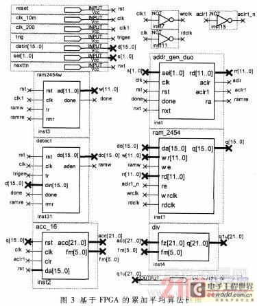 知识产权(IP)核,是指己验证的、可重利用的、具有某种确定功能的IC模块。FPGA有大量各种用途的IP核。这些IP核对内核进行了参数化,通过头文件或图形用户接口(GUI)可以方便地对参数进行操作。通过异步双口RAM IP核调用片内RAM来缓存脑电数据,保证了数据接口的同步和数据处理速度。用累加器IP核和除法器IP核来实现算法中的累加器和除法器。