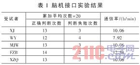 脑机接口的实验结果如表1所示,受试者是5名健康男性。正确判断时,在刺激模块停止闪烁的同时,光标立刻移向受试者注视的模块。