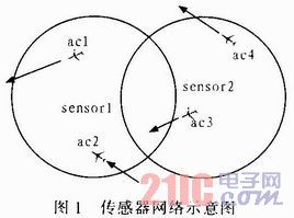 文中研究重点是传感器网络中多目标的跟踪和特征管理方法。每个传感器拥有自己的观测区域,且拥有与其邻近传感器通信的能力。如图1所示一个简单的二传感器的系统,大圆圈代表传感器的观测区域。每个传感器能够对多目标进行跟踪并在观测区域内管理目标特征。该问题的难点在于观测区域内目标的数量会随时间而变化,因此我们必须寻求一种可扩展的,在相邻传感器中具有本地一致性的方法。
