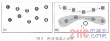 分离的过程如图2所示,其中K为轨迹数量,|Tk|为Tk的基数,当没有轨迹互扰的情况下认为Tk为一个正确的轨迹。假设一条轨迹至少包含两个观测值,因为不能由一个单一的观察值确定一条轨迹。于是再假设e(t-1)为时刻t-1之后目标的数量,z(t)为时刻t消失的目标的数量,c(t)=e(t-1)-z(t)为时刻t-1到t未消失的数量。设a(t)为时刻t新出现的目标,d(t)为时刻t的实际目标,g(t)=c(t)+a(t)-d(t)为未识别的目标。最后,设f(t)=n(t)-d(t)为错误报警数量,有: