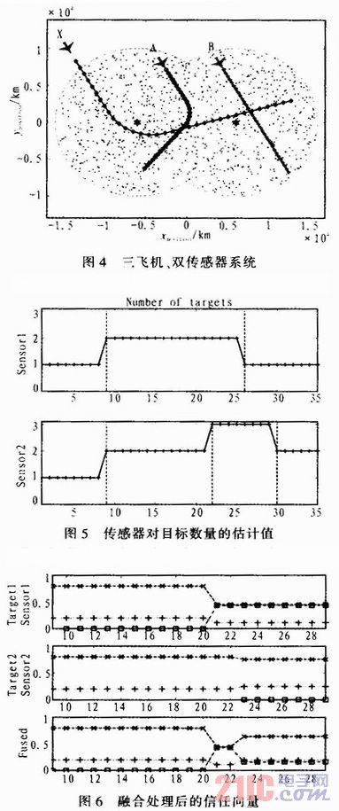特征信息(信任向量)的融合能够被表述为最优化的问题。3个不同的成本函数,香农信息(Shannon information),切尔洛夫信息(Chemo ff information),以及莱布勒距离(Kullbaek-Leibler distances)之和代表了不同的性能指标。本文场景中所有的传感器都参与协同工作,因此我们采用香农信息的方法。