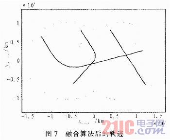 信息融合能够降低目标交叉运动所产生的不确定性。鉴于香农信息效率的优越性,在该试验中我们运用了该方法来实现信息的融合。图6所示为融合的信任向量,图7为实现状态估计融合后各传感器所估算的轨迹。