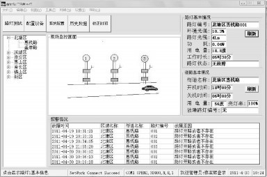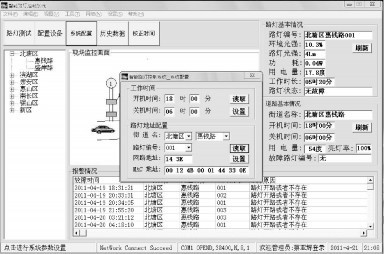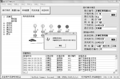 显示监控程序包括路灯状态信息、街道状态信息、报警信息。通过显示监控界面可以实现街道选择; 观察路灯当前光通量、功耗、工作时长及是否故障; 自动统计该街道的总用电量、亮灯率; 系统自动工作的时间段; 显示当前街道故障的路灯编号及该路灯在什么时间发生故障。