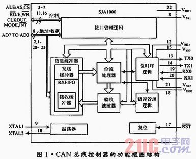 SJA1000是PHILIPS公司于1997年推出的一种独立CAN总线控制器,用于汽车和一般环境中的控制器局域网络。SJA1000主要由以下几个部分构成:接口管理逻辑、发送缓冲器、接收缓冲器、接收滤波器、位数据流处理器、位时序逻辑、错误管理逻。SJA1000是双列直插式集成电路,功能框图如图1所示。