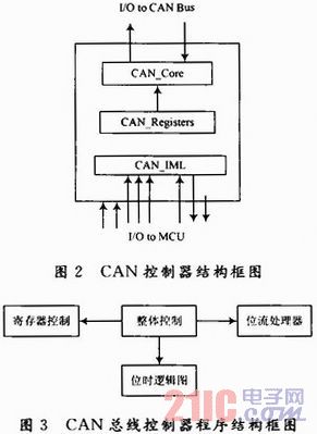 CAN_Core为CAN协议控制器的核心部分,完成CAN协议中的数据链路层的全部功能以及物理层的部分功能,包括LLC子层的接收滤波、超载通知和恢复管理、MAC子层的数据封装/拆装、帧编码、媒体访问管理、错误检测、错误标定、应答和串行化/解串行化、以及物理层的位编码/解码、位定时和同步。CAN_Registers为一寄存器组,外部微处理器可以通过地址直接访问这些寄存器。根据功能框图,设计了CAN总线控制器的程序结构,如图3所示。