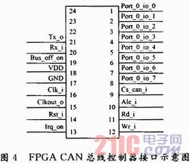 图中Port_0_io_7到Port_0_io_0为地址/数据复合总线。Cs_can_i为片选输入信号。当Cs_can_i为0时允许访问CAN总线控制器。Ale_i为1时,允许对寄存器进行赋值。Rd_i和Wr_i为微处理器的读使能信号和写使能信号。Irq_on为中断输出信号,用于中断微处理器。Rst_i为复位输入,用于复位CAN接口。Clkout_o为FPGA CAN控制器提供给微处理器的时钟输出信号,时钟分频寄存器可禁止该引脚输出。Bus_off_on控制总线关闭和总线开放接口,Tx_o和Rx_i与收发器相连,向总线发送和接收数据。