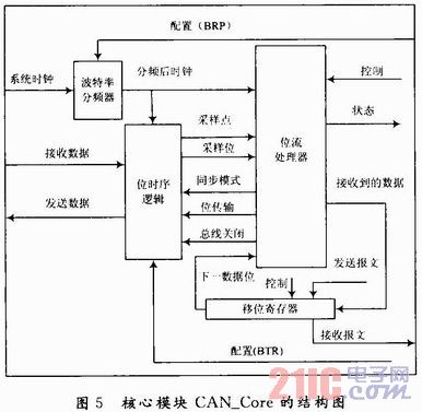 CAN_Core为整个CAN控制器的核心,负责处理CAN的协议。核心模块由4个部分组成,结构如图5所示。