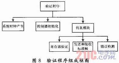 本文最后设计了CAN总线控制器的测试程序,其目的是模拟一块微处理器对CAN总线控制器进行读写操作,从而实现对CAN总线控制器的寄存器访问,完成总线收发功能。在该测试程序编写中,各个功能基本上以任务的形式实现,进行不同的仿真时只需调用相关的任务模块。图8为验证程序的组成框图。