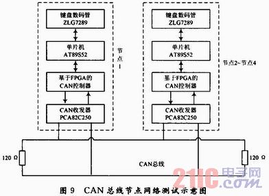 仿真验证完成以后将其HDL CAN总线程序下载到FPGA中进行测试,目标芯片采用Cyclone系列的EP1C6Q240C8,为了验证所设计的FPGA CAN总线控制器,还设计了一款基于该FPGA的CAN总线控制器的节点电路,然后利用所设计的节点电路与其他3个利用SJA1000作为控制器的CAN总线节点进行了通信测试。所有的节点使用AT89S52单片机作为节点微处理器,PCA82C250作为收发器,测试结果表明下载到FPGA中的控制器程序工作正常,实现了预计的CAN总线通讯功能。测试网络示意图如图9所示。