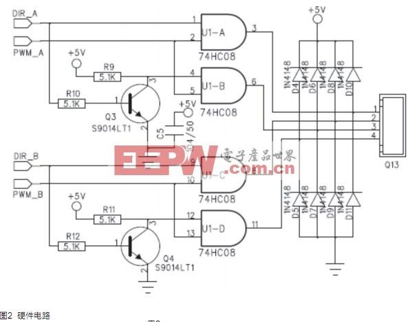 使用该单片机具有PWM功能的PB1和PB2连接PWM_A和PWM_B,使用两个普通引脚连接DIR_A和DIR_B即可实现对电机的控制。原理说明如下:电机的A、/A、B、/B分别对应四输入与门电路的3、6、8、11引脚。在DIR_A和DIR_B为低电平时,门电路的1、9引脚为0状态,三极管Q3、Q4截止,门电路的4、12引脚由于上拉处于1状态,这样,与门电路的3、8输出为0,即A、B为0;此时与门电路的6、11输出与PWM_A和PWM_B保持一致,即/A、/B由PWM_A和PWM_B决定。在其他状态下,也具有同类特点:A和/A之间、B和/B之间的通电极性由DIR_A和DIR_B决定;A和/A之间、B和/B之间的电流大小由PWM_A和PWM_B的占空比决定。而且只要三极管Q3、Q4工作正常,与门电路就不会出现逻辑混乱的情况。