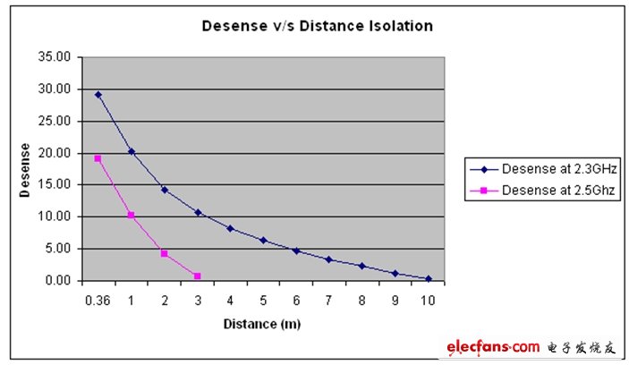 图7:随着WiMAX与802.11 AMP之间距离的缩短,WiMAX接收器的减敏度将增加。