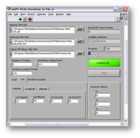 由于 GPS 接收器是透过天线传输数据,并取得卫星星历与星历信息;当然,仿真的 GPS 讯号亦需要该项信息。卫星星历与星历信息,均透过文本文件表示,可提供卫星位置、卫星高度、机器状态,与绕行轨道的相关信息。此外,在建立波形的过程中M,亦必须选择客制参数,如星期时间 (TOW)、位置 (经度、纬度、高度),与仿真的接收器速率。以此信息为基础,工具组将自动选择最多 12 组人造卫星、计算所有的都卜勒位移 (Doppler shift) 与虚拟距离 (Pseudorange) 信息,并接着产生所需的基频波形。为了可尽快入门,工具组安装程序亦包含范例的卫星星历与星历档案。此外,更可由下列网站直接下载: