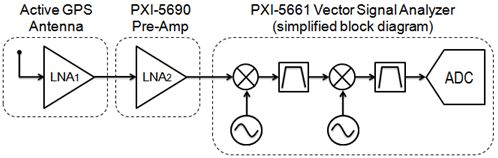 GPS 讯号记录作业最为特殊之处,即是选择并设定合适的天线与低噪声放大器 (LNA)。透过一般被动式平面天线 (Passive patch antenna),即可于 L1 GPS 频带中发现介于 -120 ~ -110 dBm 的常见峰值功率 (此处为 -116 dBm)。由于 GPS 讯号的功率强度极小,因此必须进行放大作业,以使向量讯号分析器可撷取卫星讯号的完整动态范围。虽然有多个方法可将合适的增益强度套用至讯号,不过我们发现:若使用主动式 GPS 天线搭配 NI PXI-5690 前置放大器 (Pre-amplifier) 时,即可达到最佳效果。若串联 2 组各可达 30 dB 增益的 LNA,则总增益则可达到 60 dB (30 + 30)。因此,向量讯号分析器可测得的峰值功率,将从 -116 dBm 提升至 -56 dBm。下图即为该项设定的范例系统: