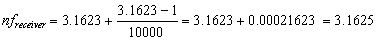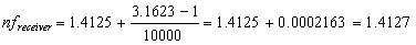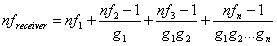 当执行串联式噪声系数计算时,必须先行针对每笔噪声系数与增益,将之转换为线性等式;即所谓的「噪声因子 (Noise factor)」。当以串联的 RF 组件计算系统的噪声系数时,即可先找出系统的噪声因子,并接着转换为噪声系数。因此系统的噪声系数必须使用下列等式计算之: