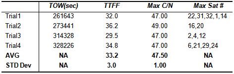 根据初始的 「Off-the-air」结果,则可发现 GPS 接收器在标准的 3 秒误差内,可达到 33.2 秒的 TTFF。这些量测结果均位于 TTFF 规格的容错范围内。而更重要的,即是可透过仿真与记录的 GPS 数据,进而比较量测结果与实际结果。