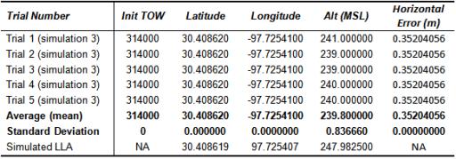 此外,若要量测 TTFF,我们亦可依不同的 TOW 建立仿真作业,以计算 LLA 的精确度与可重复性。请注意,由于在数个小时之内,可用的卫星讯号将持续变化,因此必须设定多种 TOW 以测试精确度 (如图 24)。而图 25 则表示其 LLA 信息。