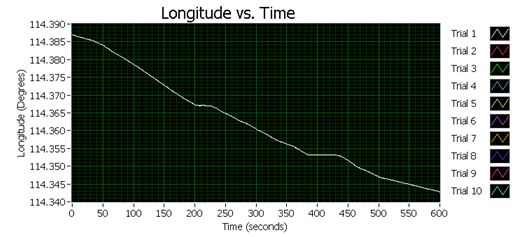 一旦我们完成 GPS 讯号的记录作业,即可透过相同的测试数据重复测试接收器。在下方的说明中,我们追踪接收器的经度、纬度,与速度。透过串行端口与每秒 1 次的 NMEA-183 指令读取速率,从接收器读取所需的数据。在下方量测中,我们所呈现的接收器特性参数,仅有定位与卫星 C/N 值。请注意,在执行这些量测作业的同时,亦可分析其他信息。虽然下列结果中并未量测水平精确度衰减 (Horizontal dilution of precision,HDOP),但此特性参数亦可提供大量的接收器定位精确度信息。