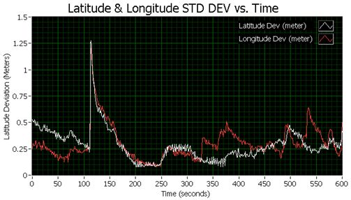 在图 27 与 28 所呈现的数据中,即使用已记录的驱动测试讯号,取得统计、定位,与速度的相关信息。此外我们可观察到,在每次的测试之间,此项信息具有相对的可重复性;即为每个独立轨迹所呈现的差异。事实上,这就是我们最需要的接收器可重复性 (Repeatability)。由于可重复性信息将可预估 GPS 接收器精确度的变化情形,因此我们亦可计算波形各个样本之间的标准误差。在图 29 中,我们在各次同步化取样作业之间,绘出标准的定位误差 (相对于平均位置)。