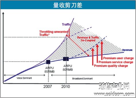另一方面,移动互联网时代,运营商普遍面临增量不增收的“量收剪刀差”收入困境,如右图所示。