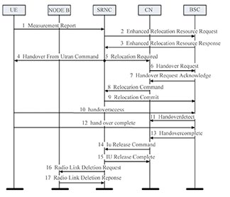 (4)RNC接收到ENHANCED RELOCATION RESOURCE RESPONSE消息后,把相关资源通过空口消息Handover From Utran Command发送给UE,同时向CN发送Relocation Required消息,在消息的Old BSS to New BSS Information中添加D-RNTI信息。