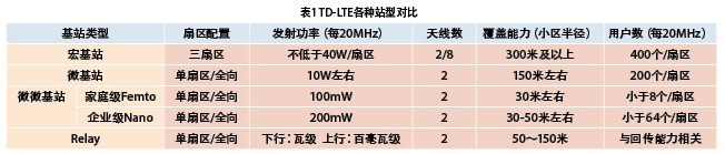 从扇区配置、发射功率、覆盖能力、用户数等角度出发,TD-LTE站型宏基站、微基站、微微基站(又包括Femto和Nano基站)以及Relay四种基站参数主要对比如表1所示。