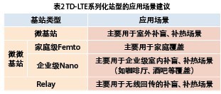结合TD-LTE各种小基站站型的特点及部署场景的需求,目前规划的小基站站型应用场景建议如表2所示。