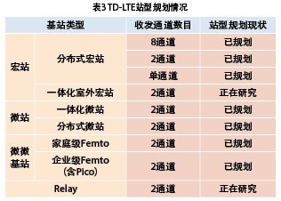目前中国移动联合主流的TD-LTE基站厂家已经基本完成了宏站、微站及微微基站的站型规划工作,其中,宏站产品重点规划了8通道、2通道和单通道三种分布式宏站产品,微站产品已经规划2通道的一体化微站和分布式微站两种产品,微微基站已经完成2通道的家庭级Femto和企业级Femto(与Pico基站类似)两种产品的规划工作,并正在研究Relay及一体化室外宏站产品的规划,具体情况如表3所示。