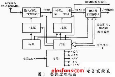 整机框图如图1所示,它由高放、一变频、一中放、二变频、二中放、标频、一本振、二本振、DSP部分、控制等部分组成。