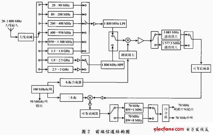 整机前端信道部分如图2所示,分别由天线输入衰减、前端输入开关滤波器组、一本振滤波放大、一混频以及一中频的滤波与放大、增益控制、二混频、二中频滤波与放大电路等组成。