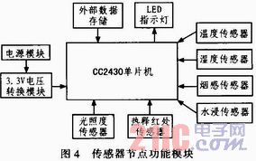 无线传感器节点由各种数据采集模块、CC2430数据传输模块、电源模块和外部数据存储等功能模块组成,功能模块如图4所示。数据采集模块负责采集监测区域的温度、湿度、光照强度、火警和水浸等信息并完成数据转换;CC2430数据传输模块负责与路由节点进行无线数据交换、传输采集数据、接收控制命令。外部数据存储模块用来保存传感器节点采集的数据。电源管理模块采用两节5号干电池。LED指示灯显示加入或退出网络的状态。