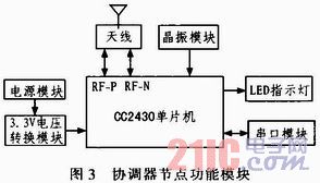 ZigBee协调器节点主要由无线收发器CC2430、射频天线RF、电源模块、晶振模块、串口模块和LED指示灯组成,功能模块如图3所示。RF的输入/输出是高阻和差动的,用于RF口最合适的差动负载是(115+180 Ω)。当使用不平衡天线时为了优化性能,应当使用不平衡变压器。由于CC2430的工作电压为3.3 V,所以要用电压转换模块把5 V降到3.3 V。CC2430可以同时接32 MHz和32.768 kHz的两种频率的晶振电路,以满足不同的要求。串口模块用于ZigBee协调器将无线接收的数据信息传送给网关,同时接收网关传送过来的控制命令。LED指示灯用于显示网络连接状态。