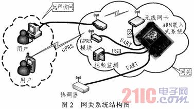 网关是互联网与无线传感器网络之间的数据通讯桥梁。本方案提供了3种网关接入方式:本地访问、手机访问和互联网访问。网关系统结构如图2所示。
