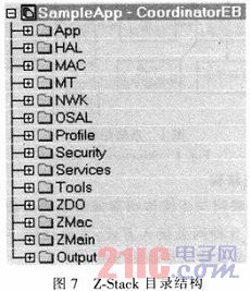 开发所用协议栈目录结构如图7所示。主要用到的文件有:ZMain/ZMian.c、Tools/f8wConfig.cfg、App/OSAL_SampleApp.c和App /SampleApp.c。其中ZigBee协议栈的main函数在ZMain.c中,总体上来说它一共做了两件事,一个是系统初始化,即由启动代码来初始化硬件系统和软件架构需要的各个模块;一个是执行操作系统实体。fSwConfig.cfg为网络配置文件。App/OSAL_SampleApp.c为操作系统任务初始化和添加文件。App/SampleApp.c为应用程序核心文件。整个Z-stack的主要工作流程大致分为:系统启动,驱动初始化,OSAL初始化和启动,进入任务轮循几个阶段。