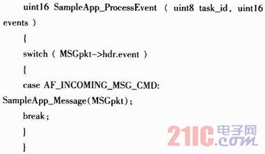 对模块的各种外部变化操作系统以事件的方式来处理,不同的宏定义代表不同事件,比如:KEY_CHANGE为按键事件;ZD0_STATE_CHANGE为网络状态变化事件;AF_INCOMING_MSG CMD表示接收到其他节点发送来的数据,该事件为无线处理的重要事件。