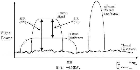 干扰还可能来源于相邻的信道。在这种情况下,802.11系统的RF子系统与数字过滤的设计还可以对AP或基站的性能造成极大影响。此外,WLAN网络的物理设计可以消除带内干扰的很多反射。通常由信号干扰比率(S/I或SIR)决定WLAN的性能,该比率的定义是数据信号与干扰信号的比率。对于WLAN的性能而言,SIR通常比信噪比(SNR)更加重要。下面的图1解释了这一概念。