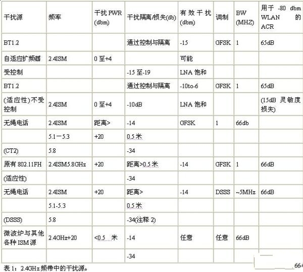 表1中的大多数干扰源均为窄带设备,如:无绳电话或蓝牙产品等。在很多情况下,该类产品可以在一米之内或WLAN客户端设备中进行操作。即使有传播损失,这些干扰源仍然可以为位于802.11接收机链路一端的LNA提供高达0dBm。